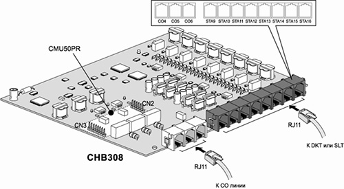 Плата CHB308 устанавливается в специальный разъем платы MBU или EMBU для CHB308/CSB316/SLIB8 (CN2), и обеспечивает интерфейс подключения 3-х аналоговых внешних линий (CO/PBX Loop Start CO Line) с поддержкой импульсной и тоновой сигнализаций. Каждый интерфейс содержит схему подачи вызывного сигнала и схему распознавания замыкания шлейфа абонентской линии, аналого-цифровой преобразователь и т.д.